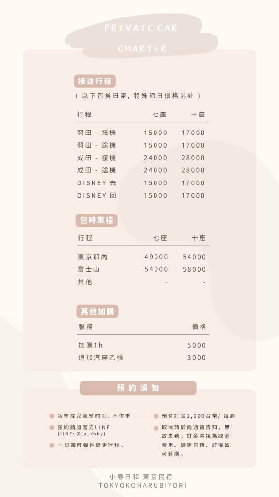 and enjoy your trip 升級般的享受,無需煩惱怎麼搭車! 只需預約好車輛, 就可以輕鬆便利的去深度旅行~ Life is all about having a good time 最適合家族旅行、閨蜜朋友間團旅!下飛機後無需多次轉乘,在指定地點上車就可以繼續放鬆休息~等待司機一起載至民宿門口,卸下行李後開始享受接下來的旅程。 good trip 安心搭乘 旅行時間寶貴,不繞路。 不必共乘 無與他人共乘併車! 能享受整趟旅途,安心地舒適到達目的地。 全程高速 通常情況機場接送全程高速。 < 司機以當下路況經驗來判斷,亦也會與顧客告知! > 中文服務 司機皆會說中文,不必擔心出遊語言不通的問題。 Private Car Charter enjoy now ✓ 預定須知:.需至少一個月以前預訂,臨時預約不見得有車輛可以派車,還請見諒!.預訂車輛時,請提供完整航班資訊、乘坐人數、行李數量。.機場接送已包含等待時間2H ,如超出2H 以上每小時加收5,000日圓。(不管是否為班機延誤,司機時間皆為排程好的,以及司機等待的時間也是時間,還請互相諒解。).如行李數量與當初提報時不符,遇車輛載不下之情況,司機能夠謝絕載多餘之行李。(可善用機場郵局配送).包車出遊皆有可能會遇塞車或路況變化之情況,如超時之情況會依狀況籌收超時費用。.『包車出遊』為避免司機疲勞駕駛,超時加購上限為2H。.一旦完成訂車,『謝絕取消預定』,因預定完成,會拒絕相同時段想乘車的顧客,把該時段保留給您。.預訂時需事前支付該筆訂單之訂金或全額。